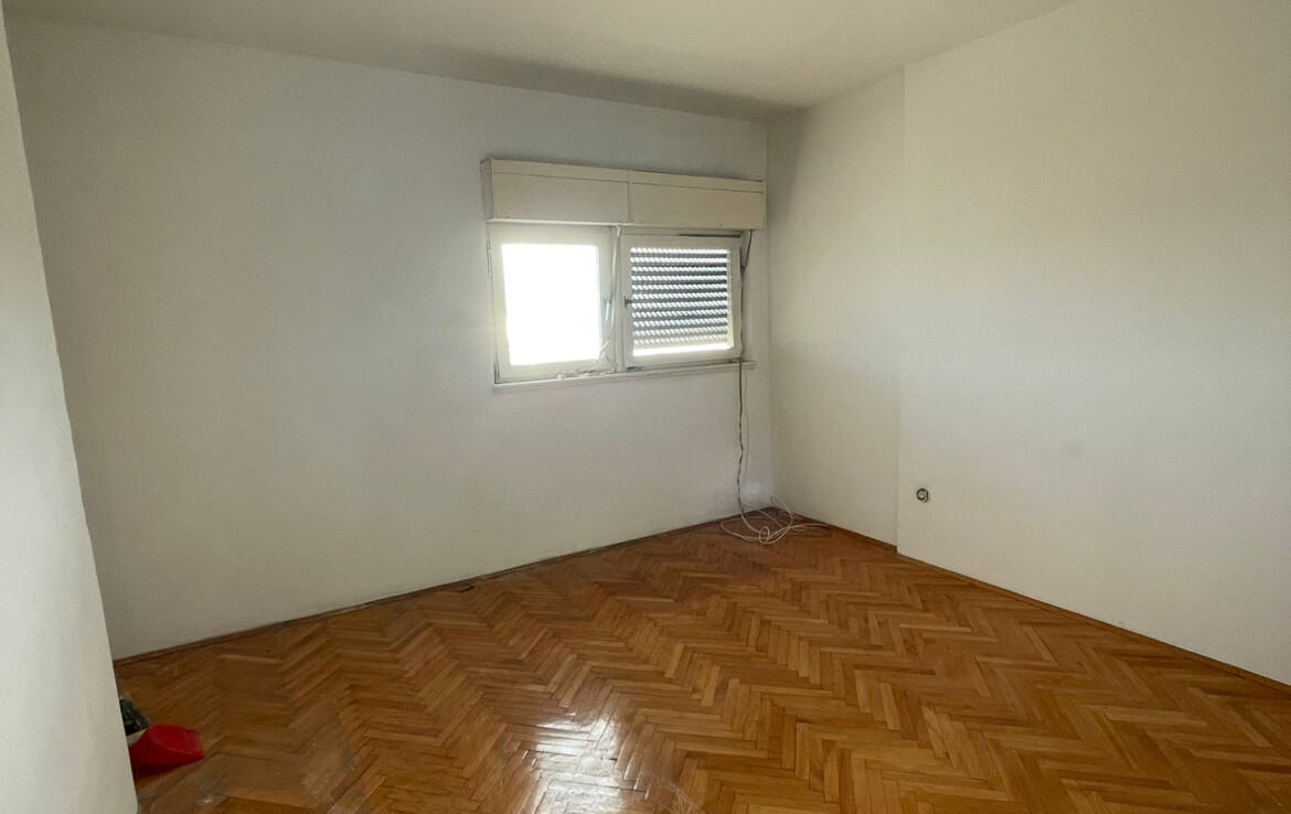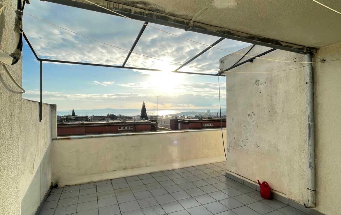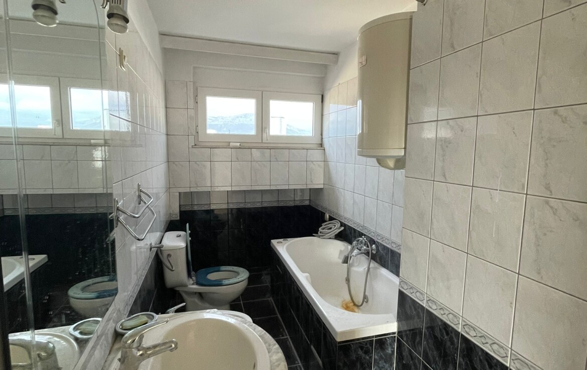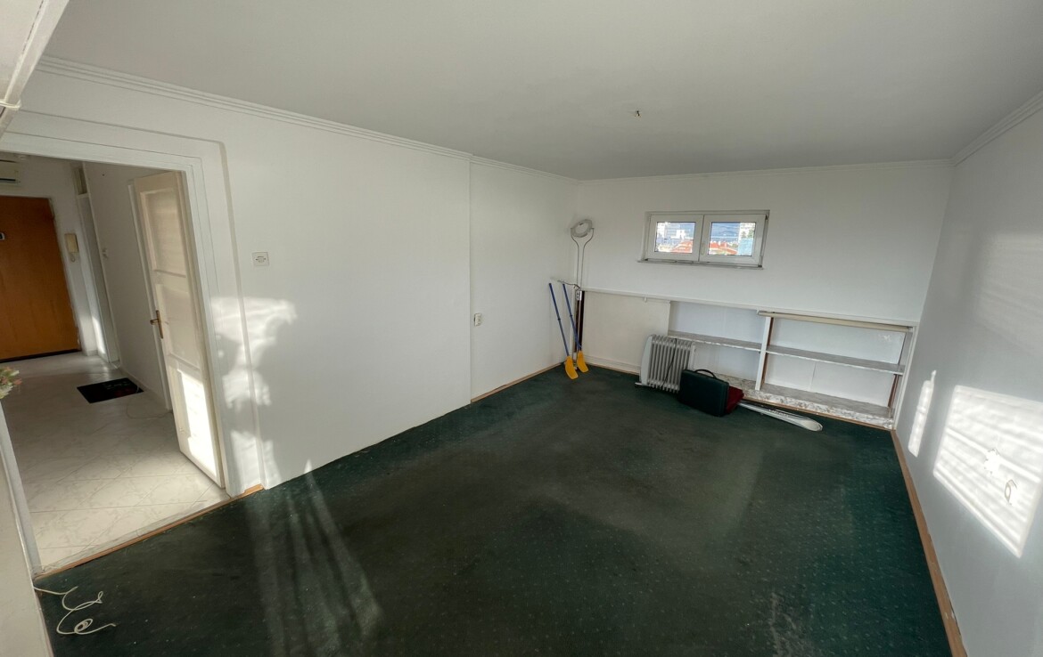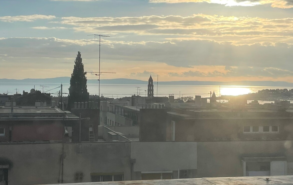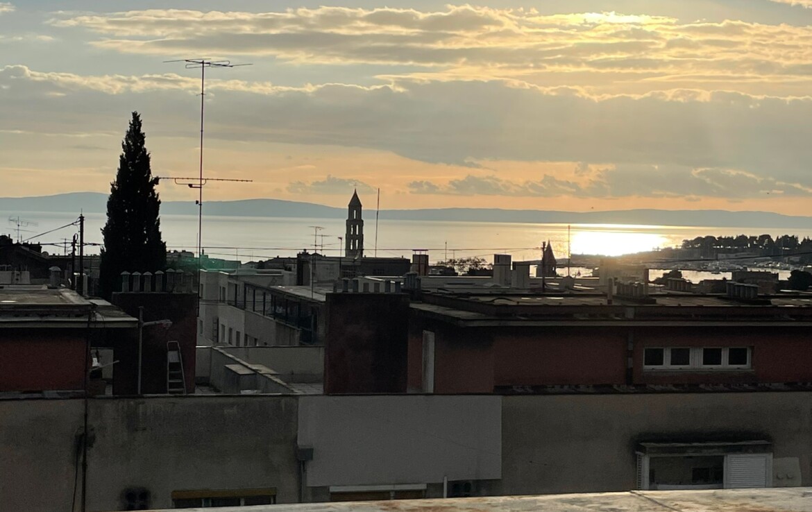 Comfortable two-room apartment for sale in Split, Manuš district. The apartment is located on the 6th floor of a residential building and has a large terrace with a beautiful view of the sea and islands and city center (Saint Domnius Cathedral). The floor plan consists of two bedrooms, hallway, bathroom, kitchen and dining room and living room with access to the terrace. The square footage indicated in the title deed is 67.34 m2, but the actual area of the apartment is 69.9 m2 + 26.57 m2 of terrace.